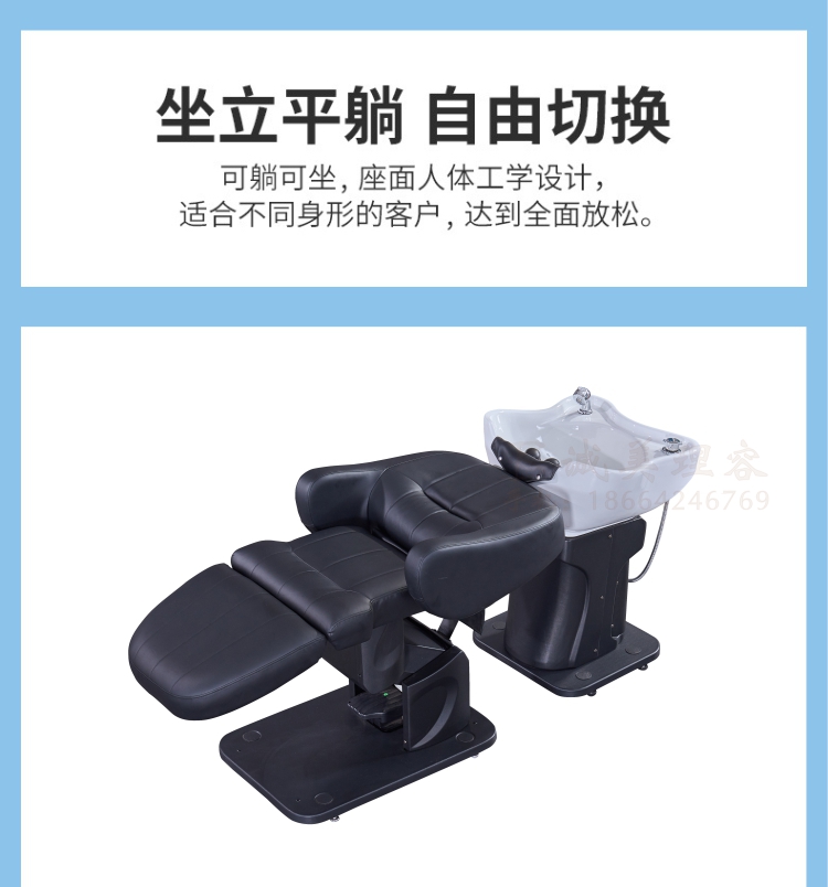 多功能电动洗头床、洗头椅,洗头、剪发、护理三合一型号:B-445B(热销款)尺寸:长195*宽65*高48.5~86cm描述:1、1个电机控制高度、背部和腿部联动升降; 2、ABS工程塑料外壳,防刮耐磨; 3、瓷盆(前高后低),设计更合理; 4、水温可调节;